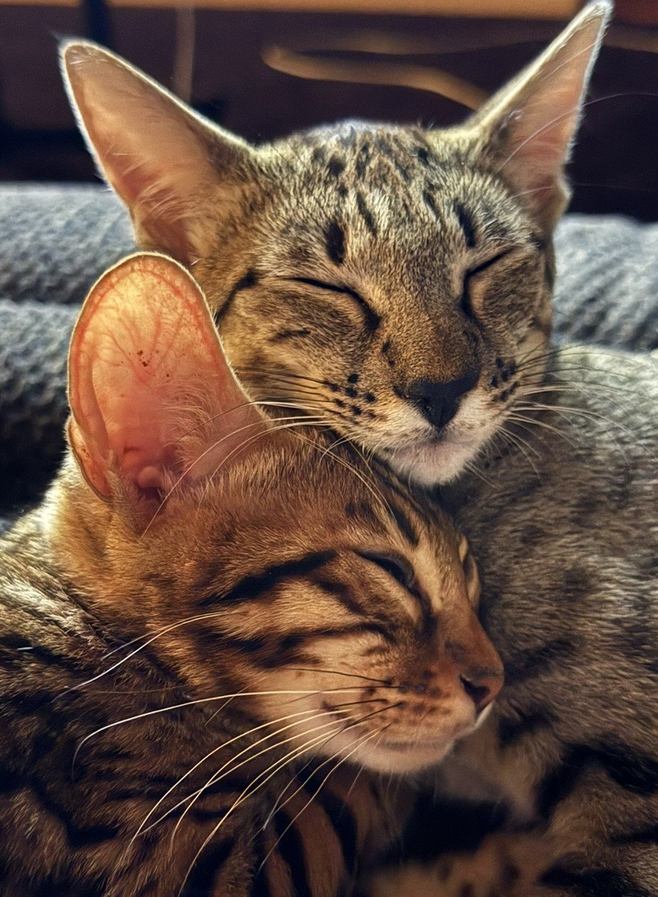 Our Savannahs look more like one another, all of them slightly different shades of gold. Their ears are enormous, very distinct “eye spots” on the back of their ears, and they are some of the most slender cats you will ever see! They love nibbling hair and sniffing armpits. They get this behavior from their Serval ancestors, as we have seen for ourselves that Servals do the same thing!