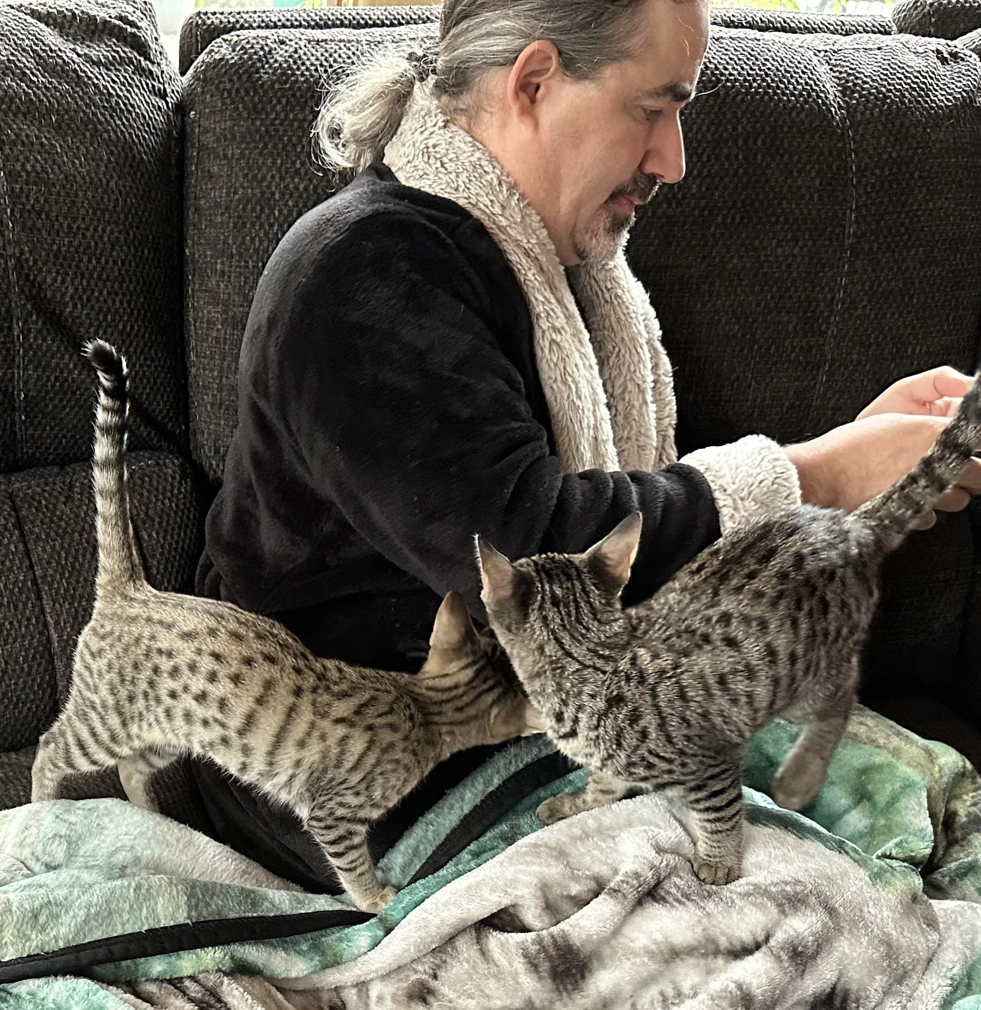 These are not your grandma’s kitty cats! Our exotic hybrid kitties do not run and hide when company comes over, they come to the door and greet them, tail held high! They don’t avoid a new human, they reach out and connect!