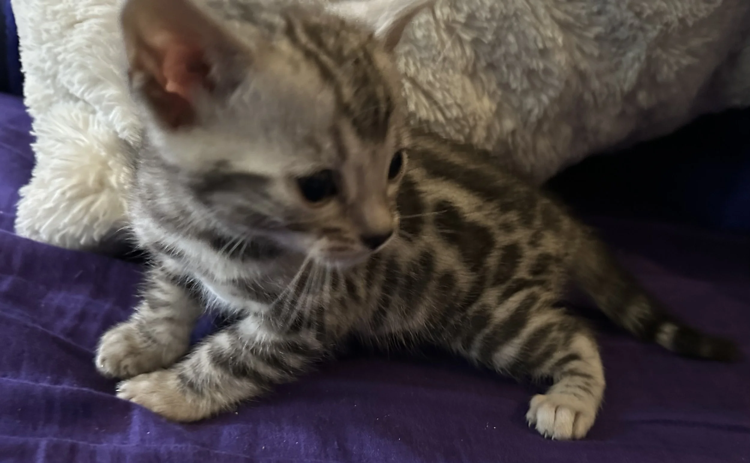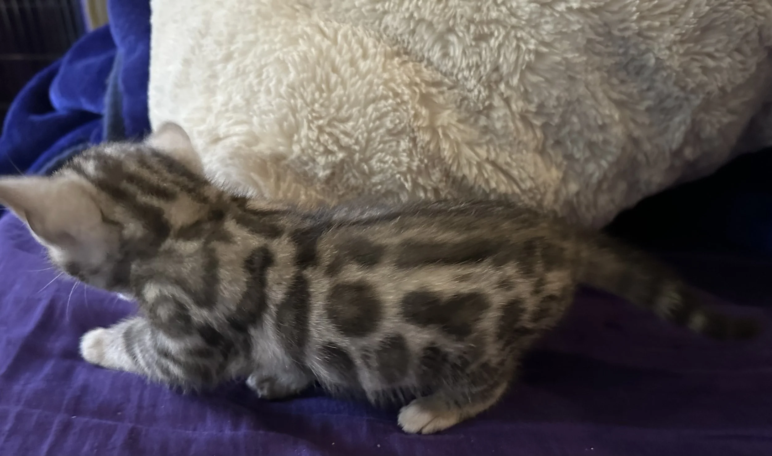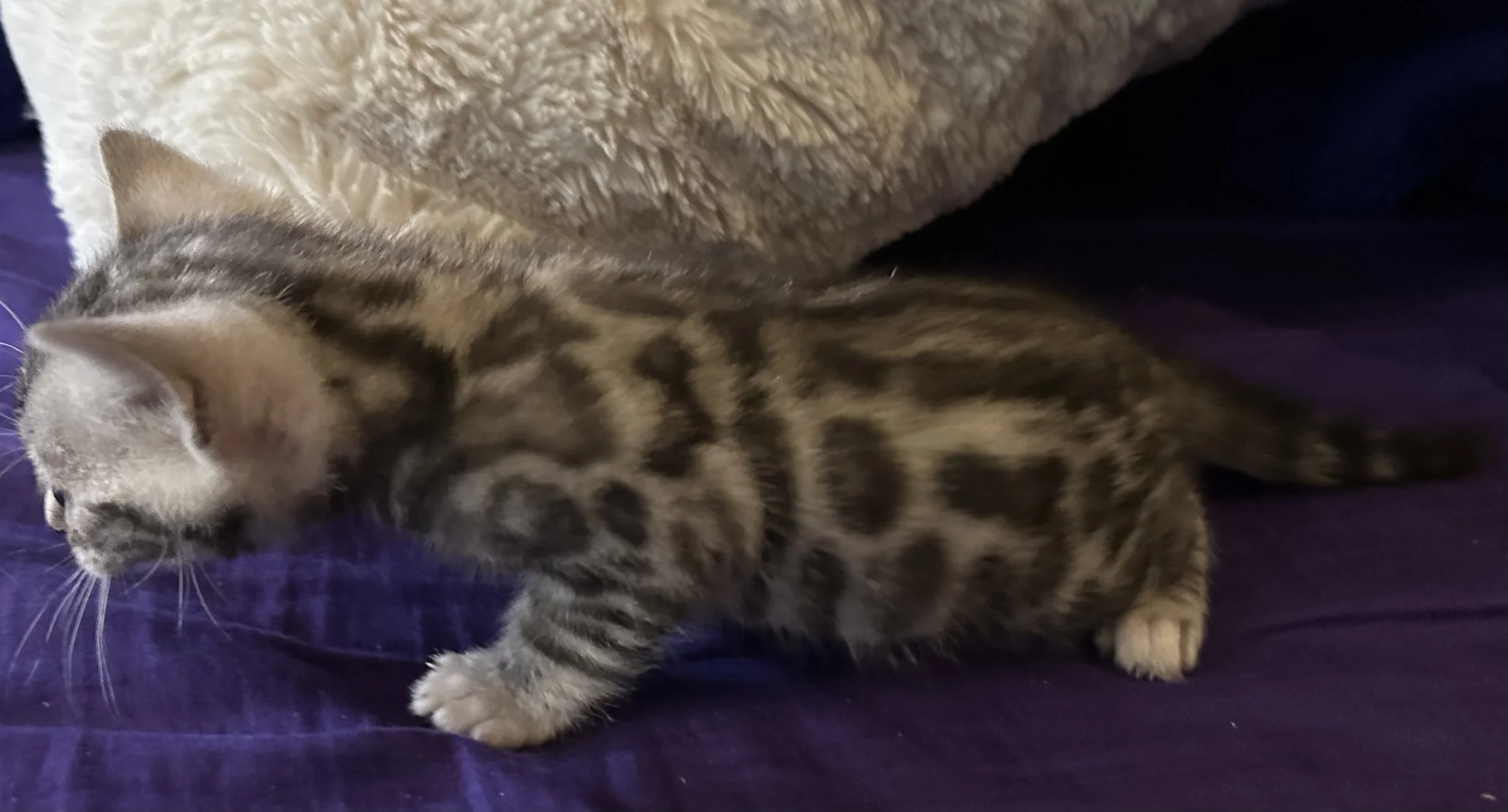 Handsome as can be, his contrast is stunning! There were three silvers born this litter, and while we are keeping his two sisters, he surpasses them both in clairty and distiction of pattern.